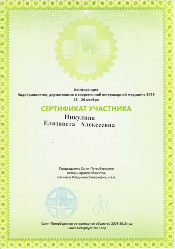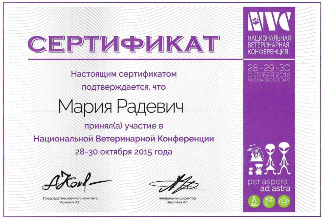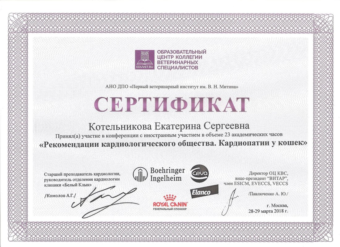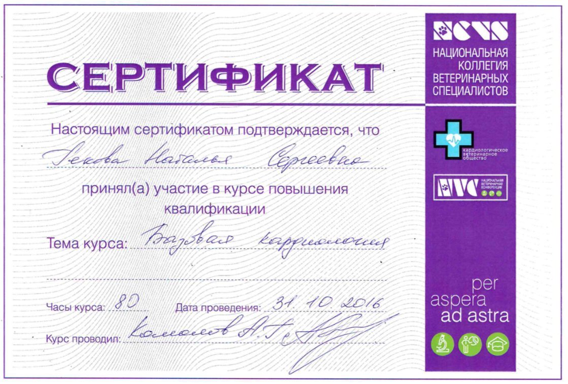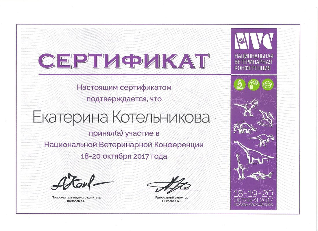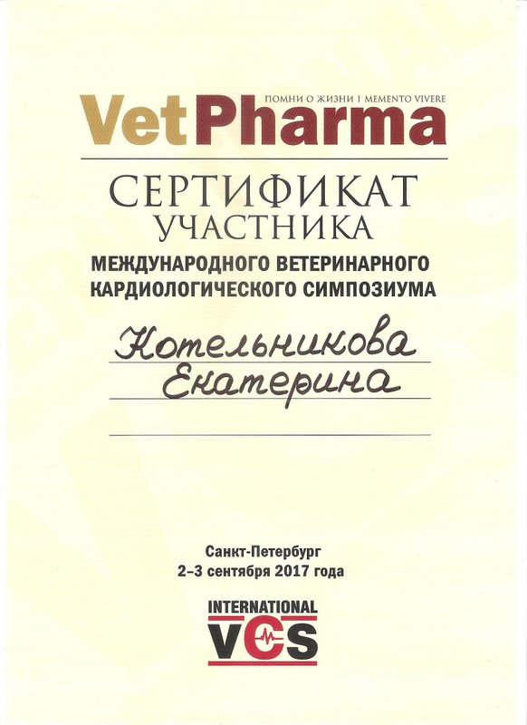 2012 год — Ветеринарное кардиологическое общество. Курсы повышения квалификации по кардиологии. 2013 год — участник Национальной Ветеринарной Конференции, Москва.
