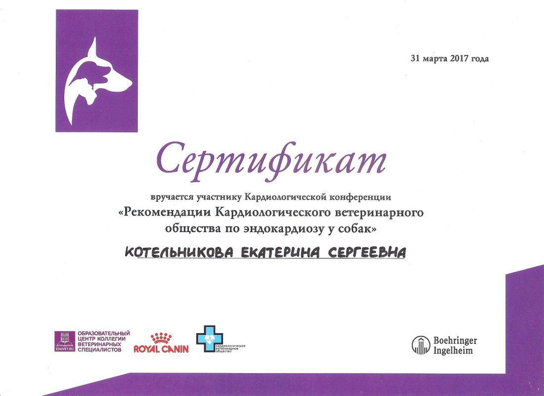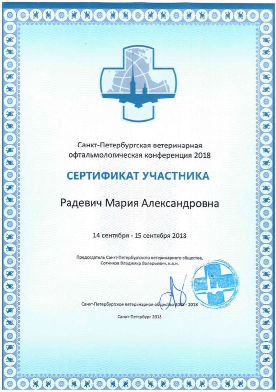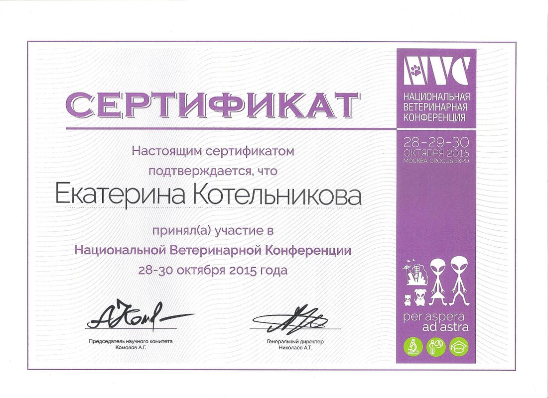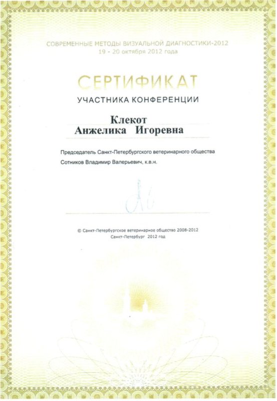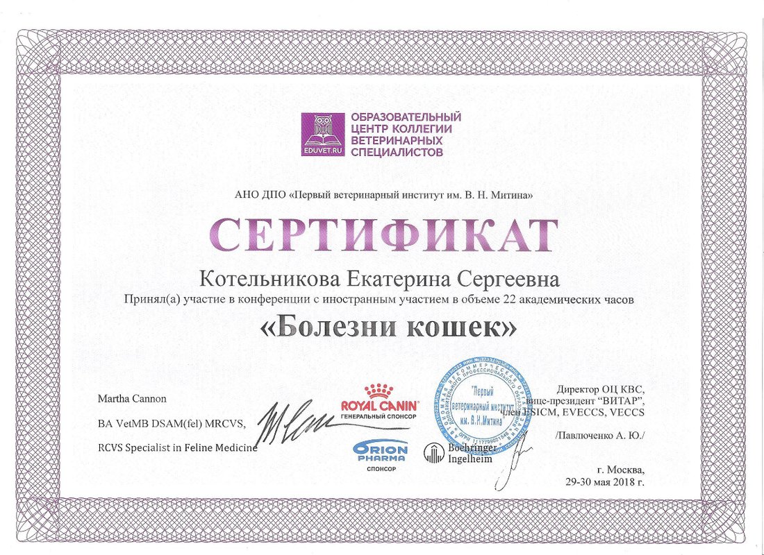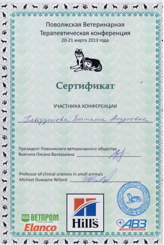 2012 год — Ветеринарное кардиологическое общество. Курсы повышения квалификации по кардиологии. 2013 год — участник Национальной Ветеринарной Конференции, Москва.