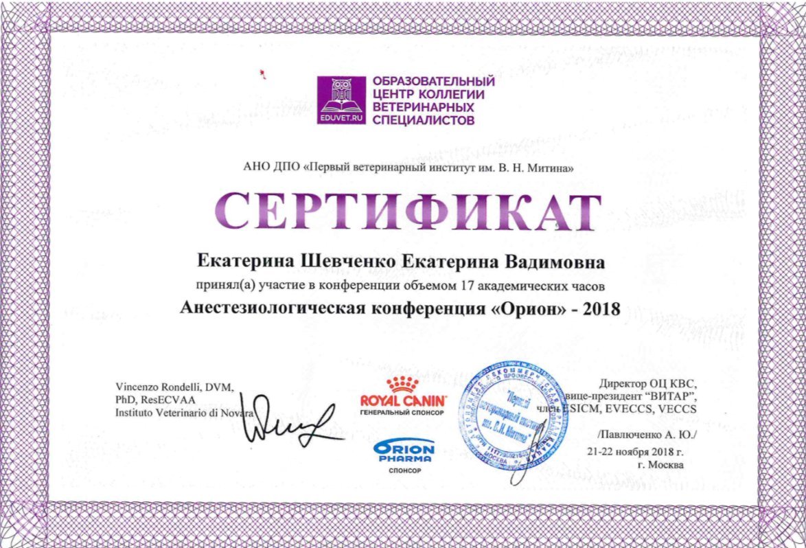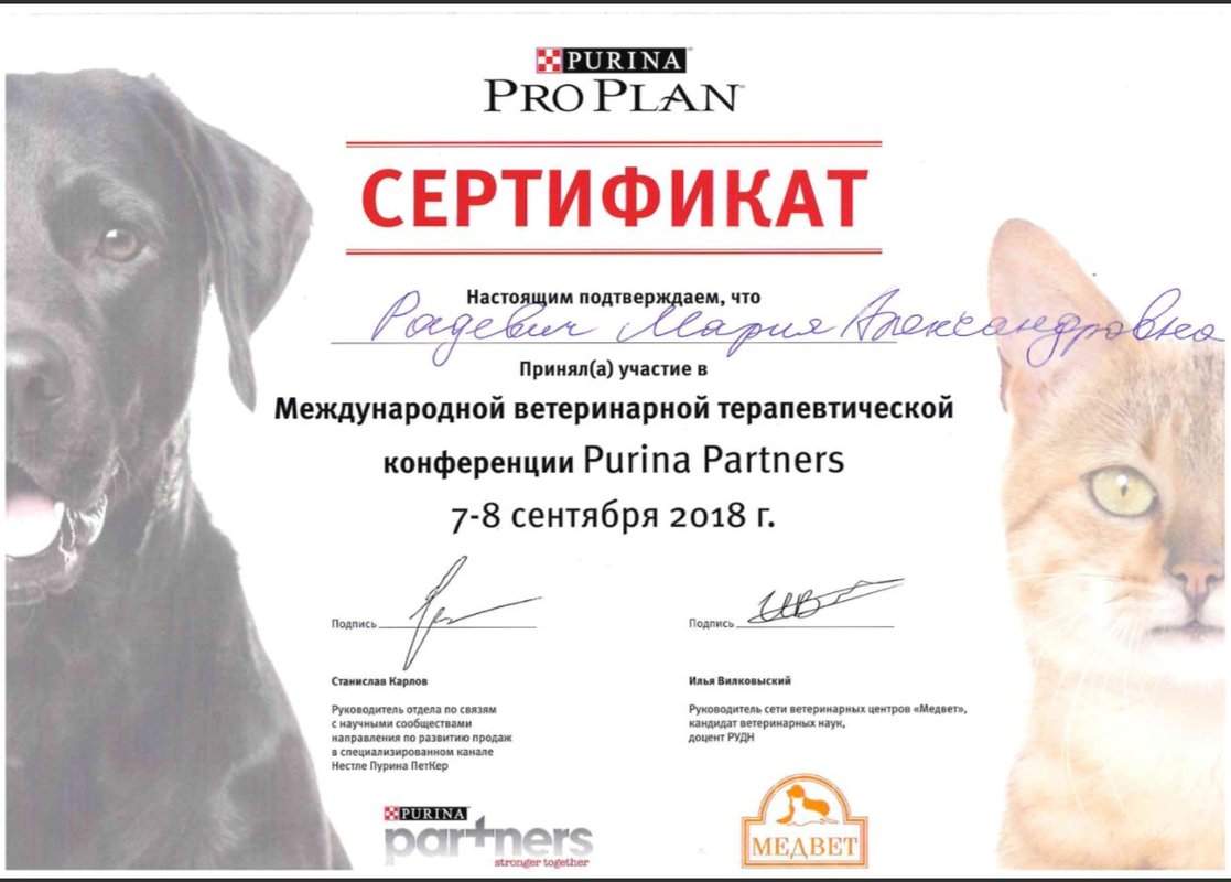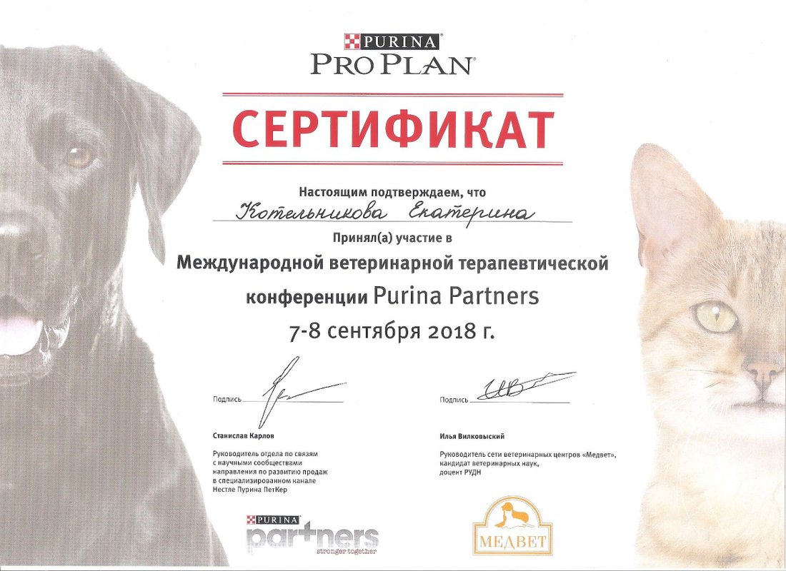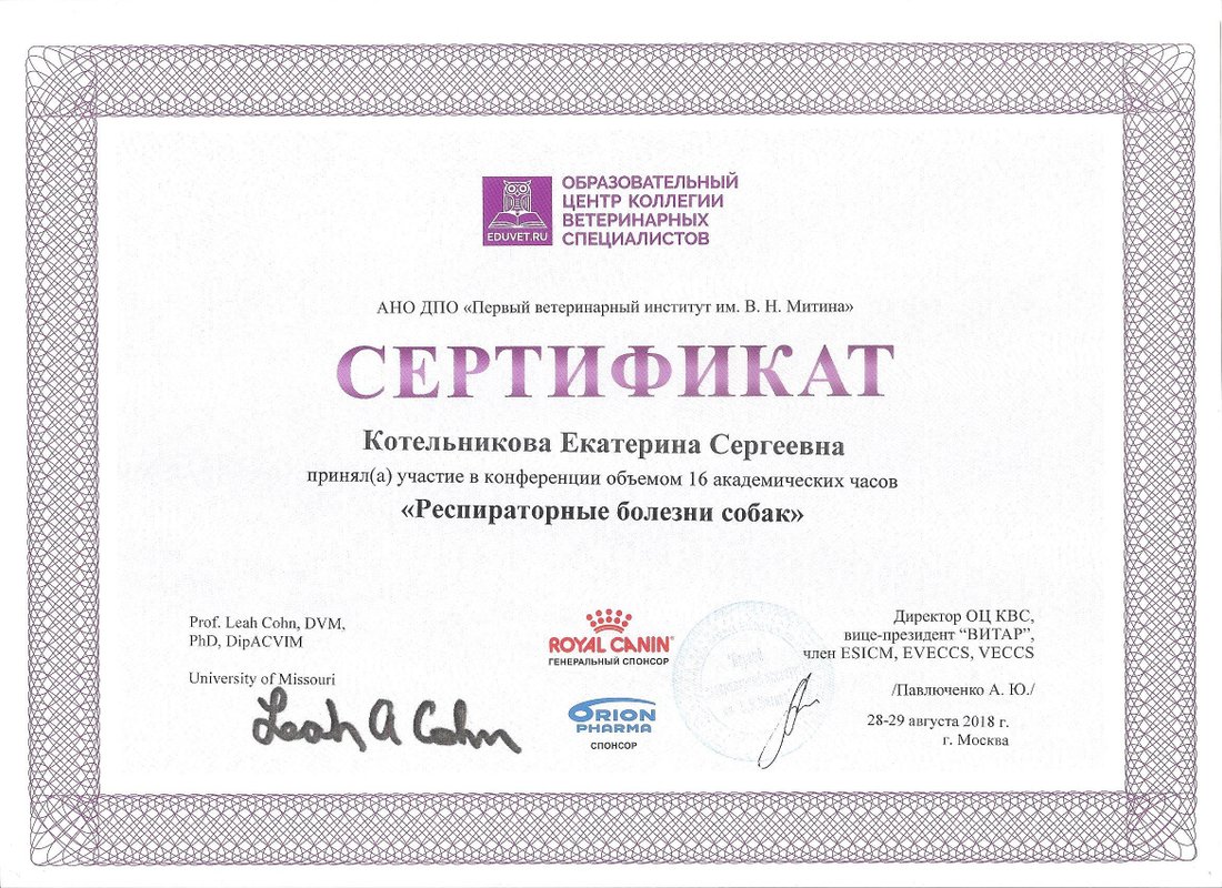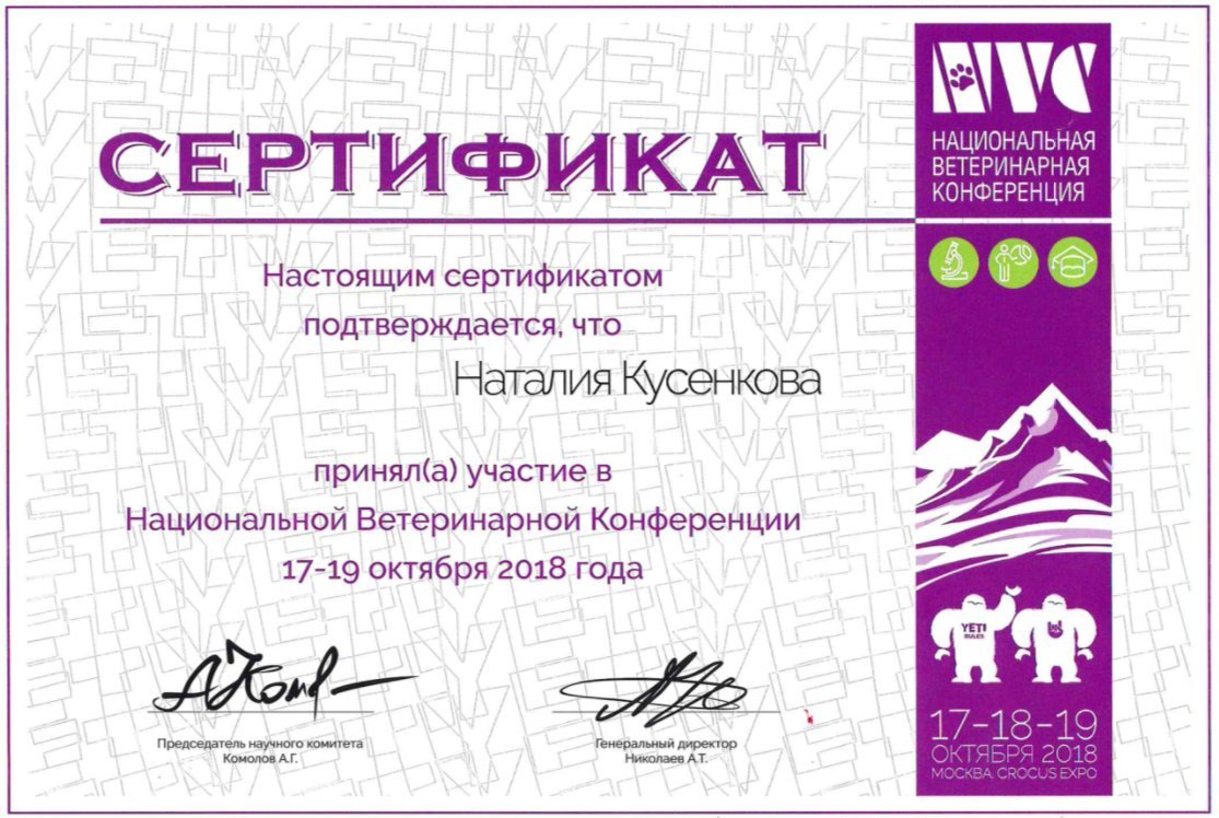 2012 год — Ветеринарное кардиологическое общество. Курсы повышения квалификации по кардиологии. 2013 год — участник Национальной Ветеринарной Конференции, Москва.