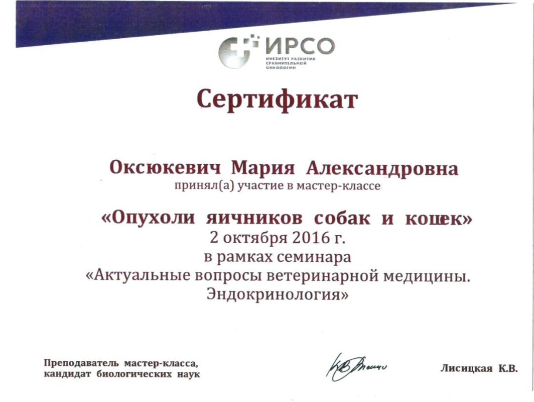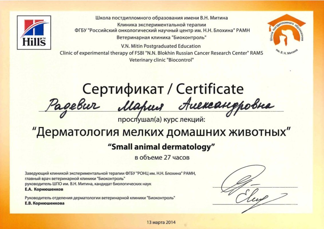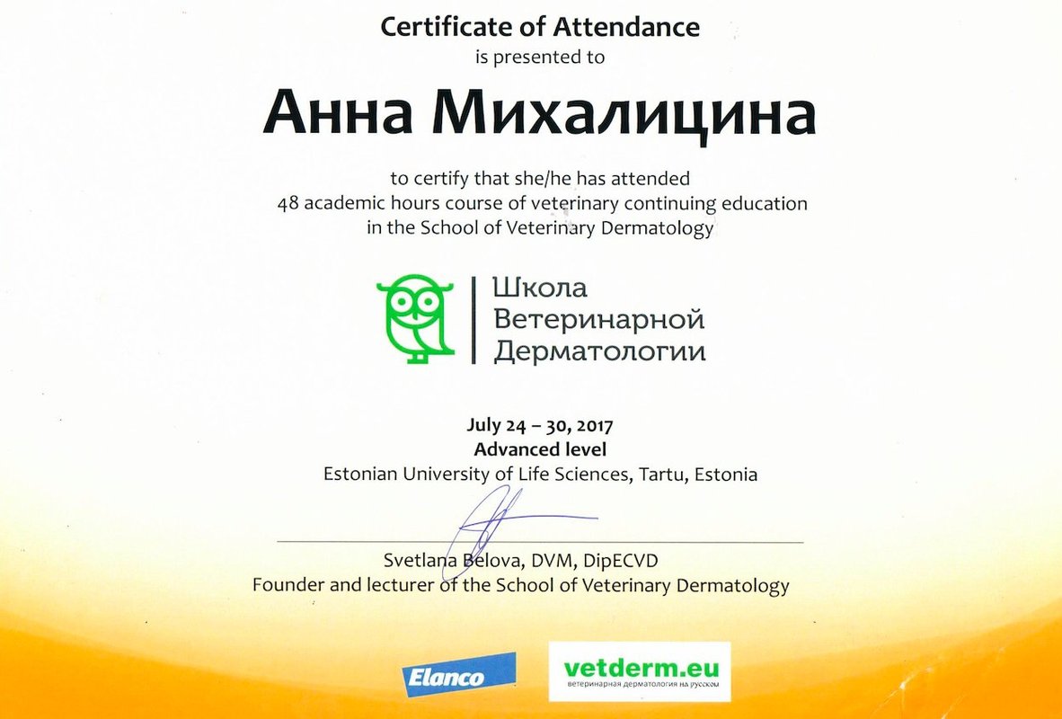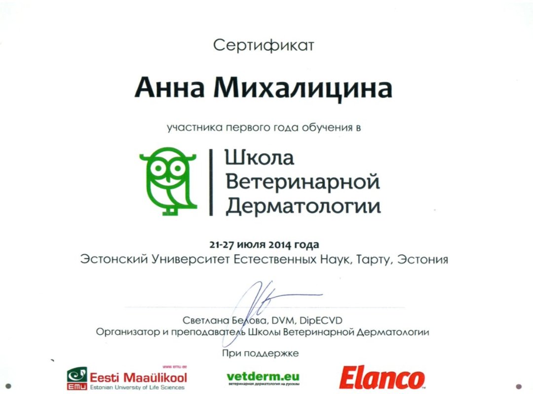 2013 — 2014 гг. — прошла обучение в двухлетней Школе Ветеринарной Дерматологии под руководством дипломанта Беловой Светланы Анатольевны, Киев, Украина.