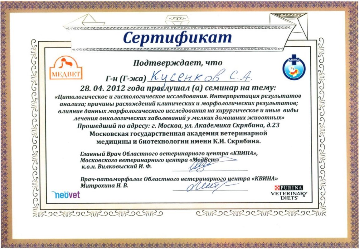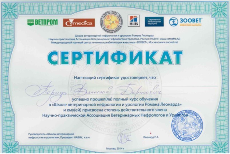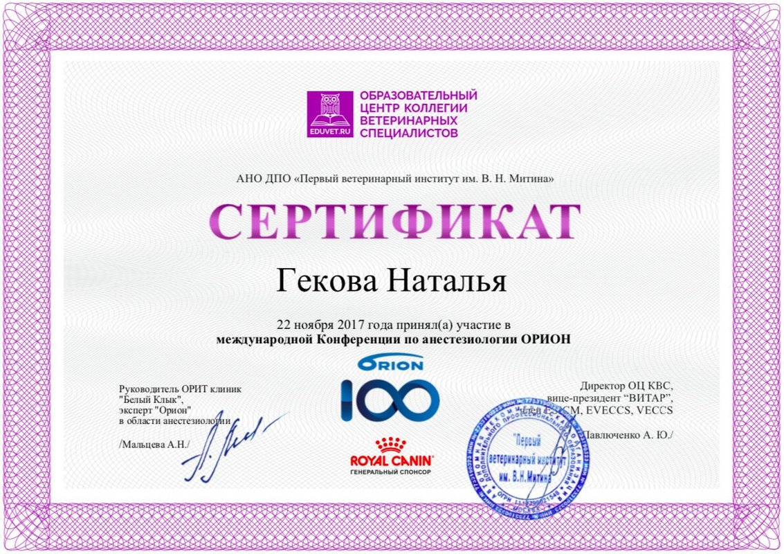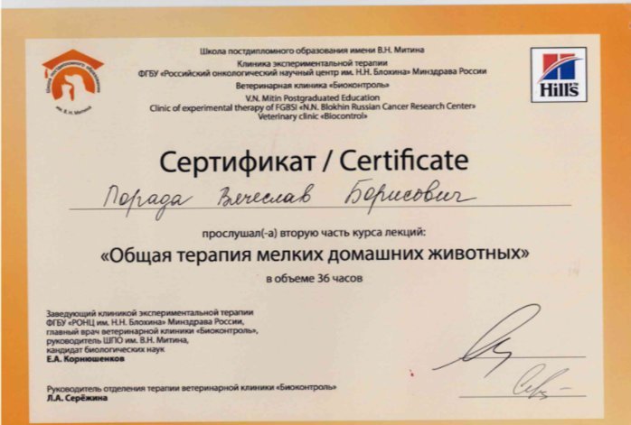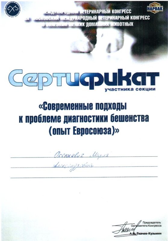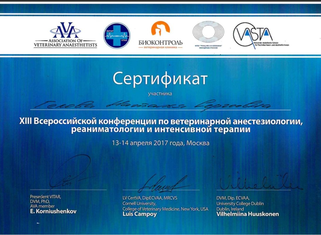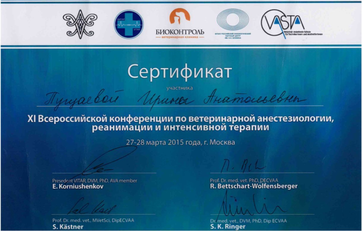 2012 год — Курсы повышения квалификации по анестезиологии и интенсивной терапии мелких домашних животных при клинике «Биоконтроль», Москва