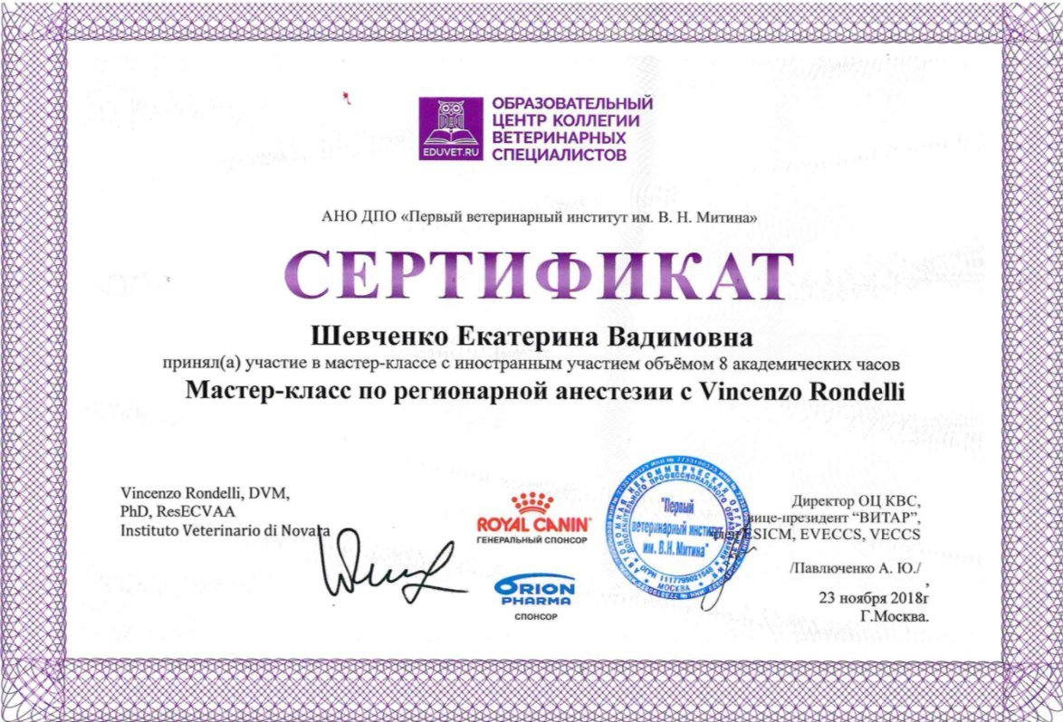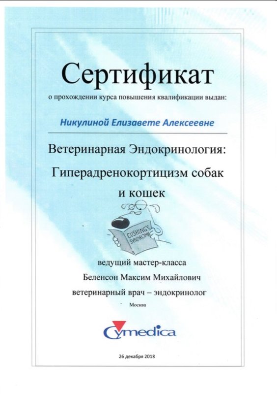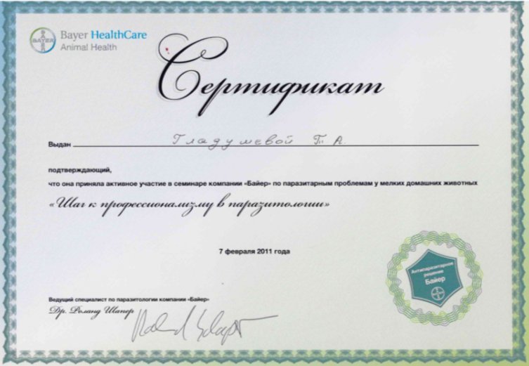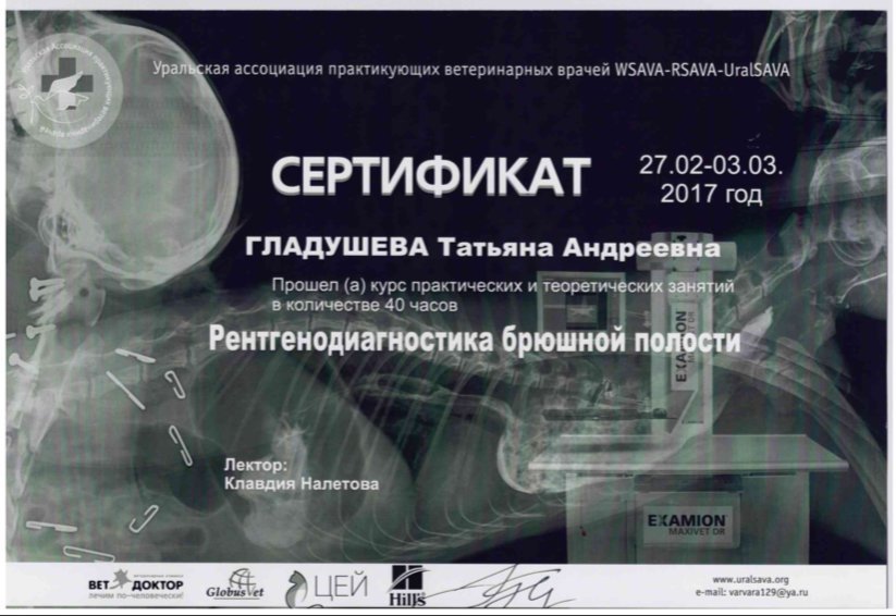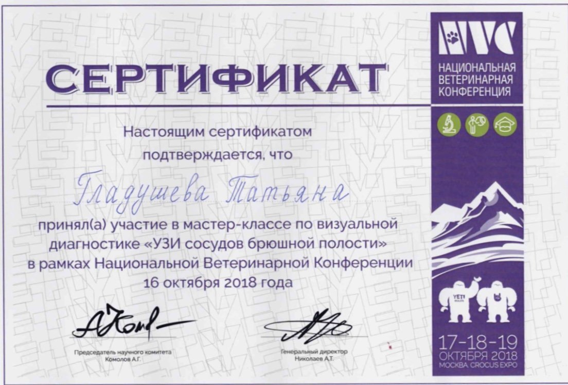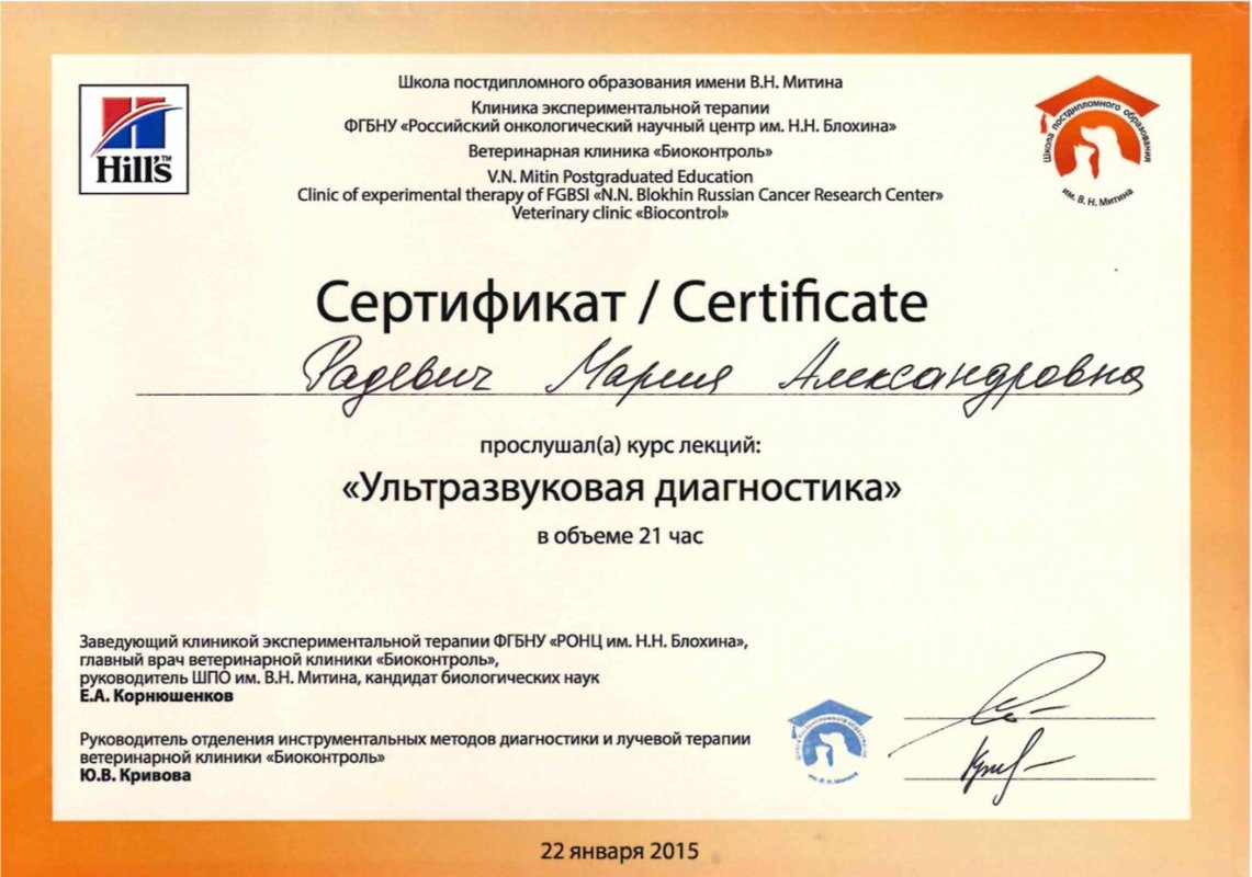 2005 год — курс повышения квалификации по теме «Ультразвуковая диагностика в ветеринарии», Ветеринарное общество визуальной диагностики, Москва.