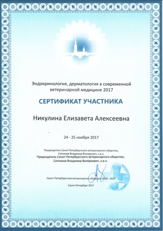 Ежегодно посещает различные конференции, семинары и мастер–классы по ветеринарии.