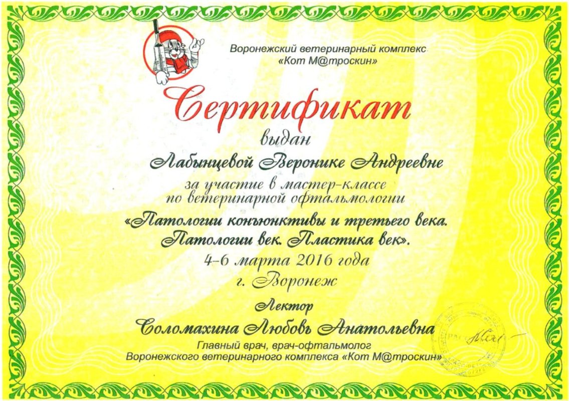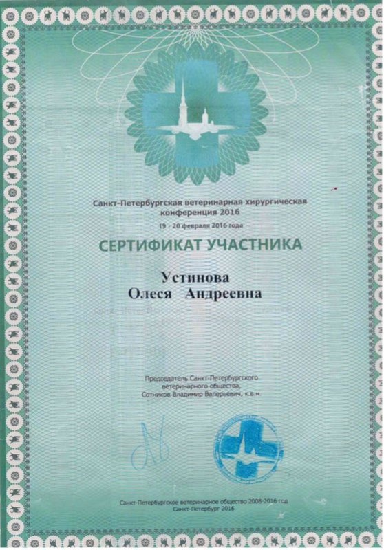 Февраль 2016 г. — 1-ая Сессия Ветеринарных Морфологов, принимала участие в качестве докладчика клинического случая.